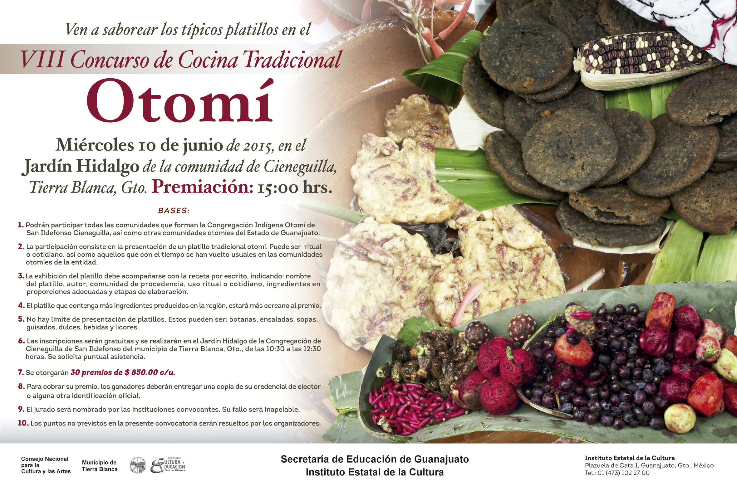 El miércoles 10 de junio me di una vuelta al «VIII Concurso de Cocina Tradicional Otomí» que se realizó en la comunidad de Cieneguilla del municipio de Tierra Blanca, Guanajuato. Este es un evento organizado por el Instituto Estatal de la Cultura de Guanajuato, y en él participaron cerca de un centenar de cocineras de los municipios Tierra Blanca, Abasolo y Dolores Hidalgo con platillos rituales o cotidianos de tradición Otomí, así que como aquellos que con el tiempo se han vuelto usuales dentro de su comunidad.